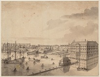 Onbekende tekenaar, Zicht op de scheepstimmerwerven van Kattenburg met het Lands Zeemagazijn, ca. 1700, pen in zwart, penseel in grijs, Stadsarchief Amsterdam